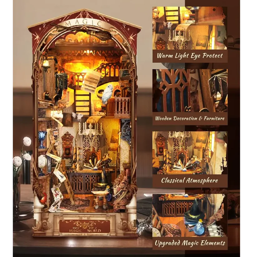 Beyond a DIY book corner, the Book Nook is a captivating collection and decoration. Immerse yourself in the miniature world with rich scenes and imaginative ideas. Gazing at the vibrant corner of the bookshelf will undoubtedly brighten your mood. It comes with a protective dust cover, making it easy to clean and maintain.